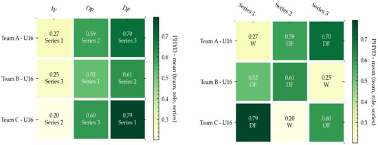 PHYD are represented in the set of six heatmaps in Figure 2, which show the comparison of different teams (Team A, Team B, and Team C), different roles (OF, DF, and W), and lastly, the different series (Series 1, Series 2 and Series 3). The data analysis in Figure 2 shows that the DF role was the one with the highest physical demands, followed by the OF role, and finally the W role. PHYD implied significantly more demands in the third series.