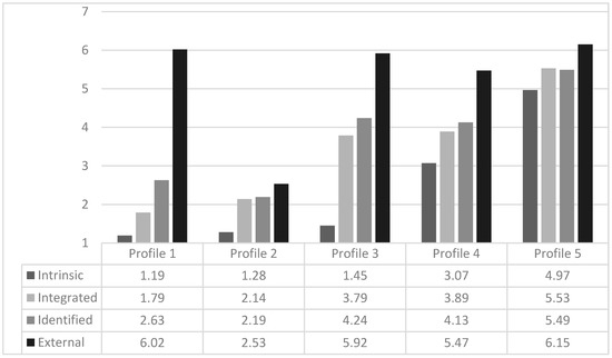 39], which represents individuals that scored moderately on all types of motivation (i.e., extrinsic, introjected, identified, integrated, intrinsic, and amotivation—when the last was also considered). Furthermore, these studies’ general conclusions are that individuals with more intrinsic profiles have more positive outcomes.