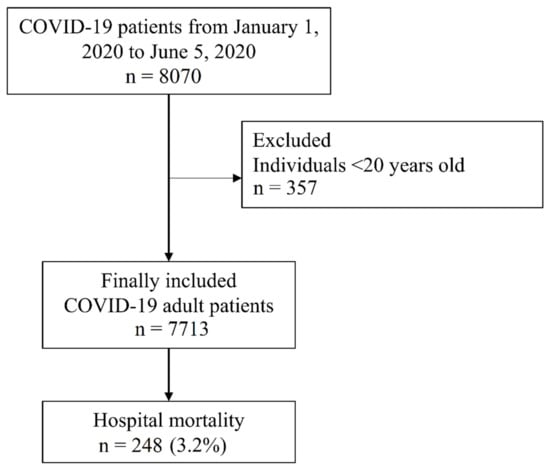 The primary endpoint of this study was in-hospital mortality among patients with COVID-19 in the NHIS-COVID-19 database, evaluated from 1 January 2020 to 27 August 2020. In-hospital mortality was defined as COVID-19-related deaths among patients with COVID-19. If a patient died after end of isolation, as the virus was no longer detected in the PCR test, it was not considered a COVID-related death.
