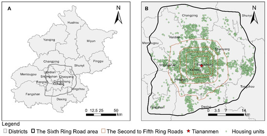 The Sixth Ring Road area and housing units in Beijing. Subplot (A): the location of study area. The red lines from the inside to the outside in subplot (B) are the Second to Fifth Ring Roads.