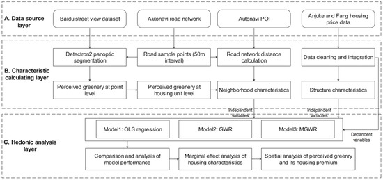 This article proposes a three-layer framework (see Figure 2) that includes data sources, characteristic calculations, and hedonic analysis layers. The data source layer includes Baidu street views, AutoNavi road network data, AutoNavi points of interest (POIs), and housing price data (Anjuke and Fang platforms’ transaction records in 2015). The characteristic calculation layer includes the generation of equidistant samples of the road network, panoptic segmentation, perceived greenery and accessibility indicator calculations, and the cleaning and integration of housing data. In addition, to address multisource data fusion, the neighborhood and structural indicators are all aggregated to the neighborhood level. In the hedonic analysis layer, we first compare the performance and parameter estimates of the OLS, GWR, and MGWR models; analyze the capitalization of house characteristics based on HPM theory; and focus on the premium of perceived greenery and spatial analysis.