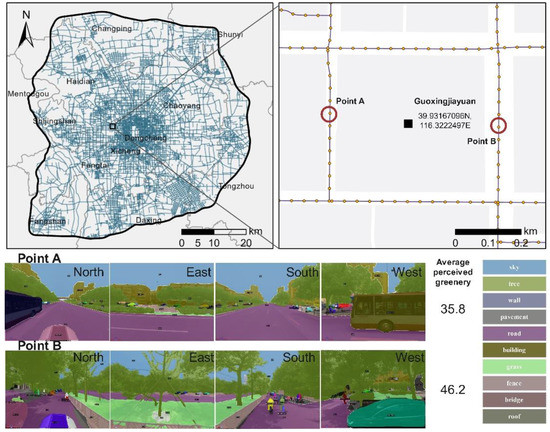The sample points around blocks with housing units were used to measure the neighborhood-scale perceived greenery (an 80 m border buffer). On average, there were approximately 23 points in each plot involved in the calculation. Taking the Guoxingjiayuan community in Beijing as an example, two streetscapes with classification masks are shown in Figure 3. The average perceived greenery scores at points A and B were 35.8 and 46.2, respectively.