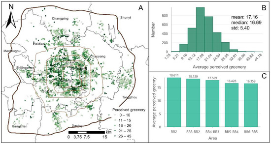 The perceived greenery distribution map and statistics in Beijing. Subplot (A): the perceived greenery distribution map. Subplot (B): the histogram and statistical results of average perceived greenery. The abbreviation “RR” in subplot (C) indicates ring roads, e.g., “RR3-RR2” indicates the Third to Second Ring Road areas.