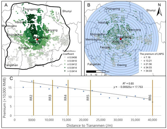 Spatial distribution of PG coefficients and premiums. Subplot (A) shows the distribution of PG coefficients. Subplot (B) takes Tiananmen as the center and uses an interval of 2.5 km to create a multiring buffer and show the PG premium gradient. The dotted brown line is the extension of Beijing’s east-west line. Subplot (C) is the premium gradient and the fitting line, and the solid brown line represents the reference positions of the five-ring roads, e.g., the abbreviation “RR2” represents the Second Ring Road.
