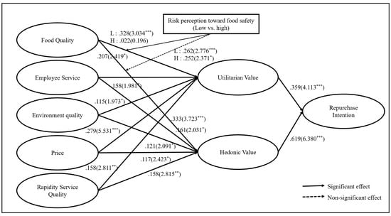 H1~H5 were supported. Food quality (β = 0.207; t = 2.419; p < 0.05), employee service quality (β = 0.158; t = 1.981; p < 0.05), physical environment (β = 0.115; t = 1.973; p < 0.05), price (β = 0.279; t = 5.531; p < 0.001), and rapidity (β = 0.158; t = 2.811; p < 0.01) had a significant effect on utilitarian value. H6~H10 were supported. Food quality (β = 0.333; t = 3.723; p < 0.001), employee service quality (β = 0.161; t = 2.031; p < 0.05), physical environment (β = 0.121; t = 2.091; p < 0.05), price (β = 0.117; t = 2.423; p < 0.05), and rapidity (β = 0.158; t = 2.815; p < 0.01) had significant effects on hedonic value. The results verified that the service quality of street food in its various dimensions is an important variable affecting utility and hedonic value. H11 and H12 were supported. Utilitarian value (β = 0.359; t = 4.113; p < 0.001) and hedonic value (β = 0.619; t = 6.380; p < 0.001) had a significant effect on repurchase intention.