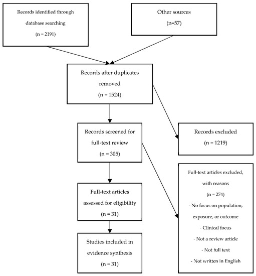 A total of 2191 citations were retrieved from the databases. Deduplication using a combination of OVID and EndNote resulted in 1524 unique citations, of which 305 full-text articles were assessed for eligibility. In total, 31 reviews [6,7,8,9,18,28,29,30,31,32,33,34,35,36,37,38,39,40,41,42,43,44,45,46,47,48,49,50,51,52,53] met the final eligibility criteria for relevance to the work and health outcomes of working during an infectious disease epidemic/pandemic (Figure 1).