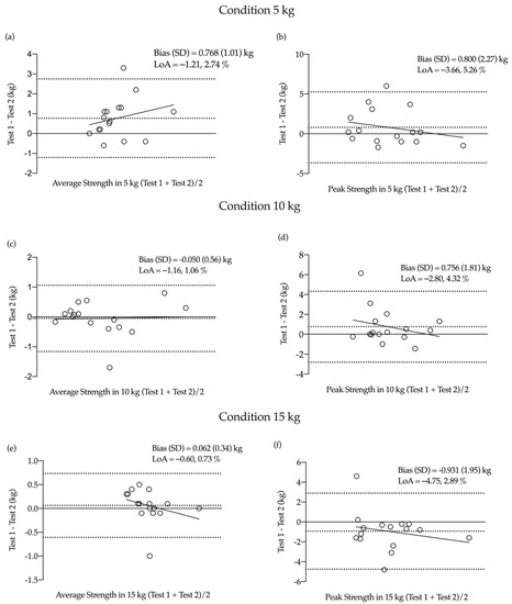 Bland–Altman plots of test–retest for average and peak strength. (a) average strength at 5 kg, (b) peak strength at 5 kg, (c) average strength at 10 kg, (d) peak strength at 10 kg, (e) average strength at 15 kg, (f) peak strength at 15 kg.