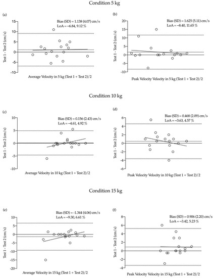 Bland–Altman plots of test–retest for average and peak velocity. (a) average velocity at 5 kg, (b) peak velocity at 5 kg, (c) average velocity at 10 kg, (d) peak velocity at 10 kg, (e) average velocity at 15 kg, (f) peak velocity at 15 kg.