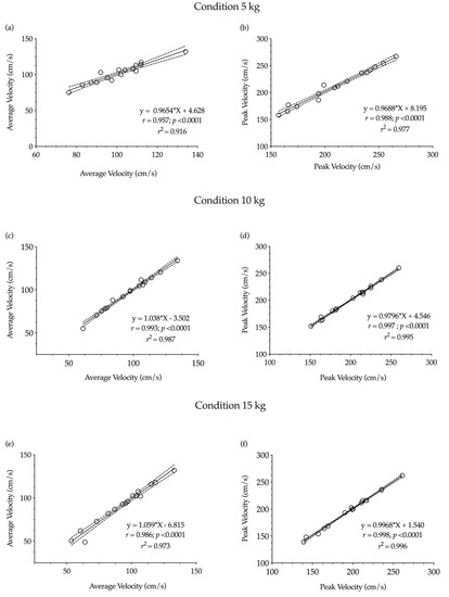 Finally, the r magnitude for average and peak strength was from very large to nearly perfect during the different experimental conditions (r range = 0.854–0.993) and nearly perfect for average and peak velocity (r range = 0.916–0.996) (Figure 4 and Figure 5).