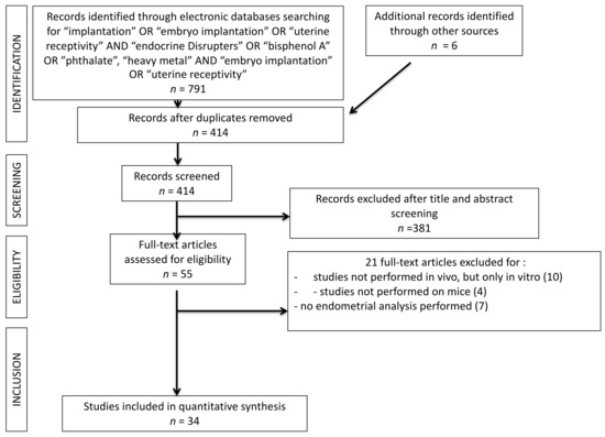 The present systematic review was carried out following the Preferred Reporting Items for Systematic Reviews and Meta-Analyses (PRISMA) guidelines. All in vivo studies analyzing the interaction of EDC on the blastocyst implantation process were searched. A search was performed on the PubMed®/MEDLINE® database and restricted for the last 20 years of publication (2000–2020). Only studies in English were included. The search was carried out in October 2020. The terms used for the search were: (“Endocrine Disrupters” OR “Heavy Metals”, OR “Bisphenol A” OR “Phthalates”) AND (“Embryo Implantation” OR “Implantation” OR “Uterine Receptivity”). A total of 791 results were obtained. One hundred fourteen duplicates were excluded. A total of 381 articles were excluded by reading the abstract and title. Fifty-five articles remained for reading the full texts. Among these studies, a total of 21 studies were excluded: 11 studies were excluded because they were about in vitro experiments, four studies because they investigated other mammalian species than mouse models; six studies because an endometrial receptivity analysis was not performed. A total of thirty-four articles were finally included into the systematic review. The study selection process was summarized on PRISMA flow chart (Figure 2).