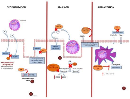 To date, there is a strong need to understand the precise molecular mechanisms involved in infertility and altered by EDC. In particular, there is a strong need to explain unexplained infertility in terms of endometrial receptivity and influence of EDC. At this scope, with the present work we aimed to systematically summarize all available data about EDC effects on blastocyst endometrial implantation process, in order to give new insight, which could help gynecologists worldwide to prevent long-term injuries caused by EDCs on human fertility.
