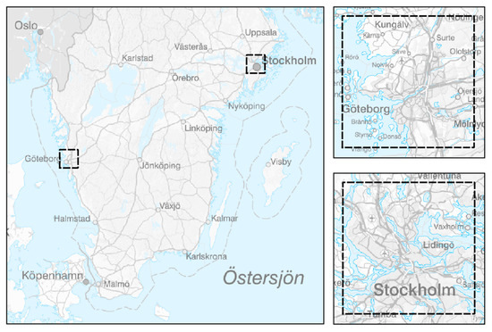 Modeling areas of 35 × 35 km2. An overview is displayed on the left; zoomed in maps are shown for Gothenburg (upper right) and Stockholm (lower right).