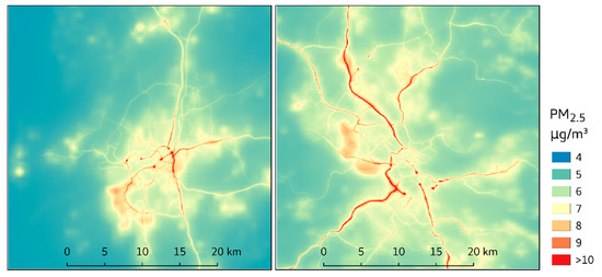 Yearly average concentrations of PM2.5 during the baseline year 2011 in Gothenburg (left) and Stockholm (right) [14].
