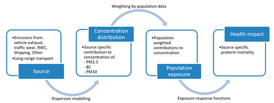 The evaluation of health impact follows the impact pathway chain [24] presented in Figure 3. Using source-specific exposure estimates, the number of premature deaths was attributed to different emission sectors (see Table 1).