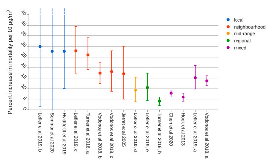 Percent increase in mortality per 10 µgm−3 PM2.5 categorized by spatial resolution of exposure data. “Local” corresponds to <1 km resolution, “neighborhood” to 1–10 km, “mid-range” to 10–100 km, and “regional” to >100 km. Confidence intervals (95%) are shown as dashed where outside the scale. In the figure, the estimate denoted as “near-source” by Turner et al. [28] is categorized as the neighborhood scale. The data presented in the figure can be found in Table A1.
