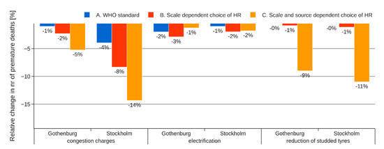 A HIA or a cost–benefit analysis based on a regional HR that severely underestimates the benefits of reducing local emissions would discourage cities from implementing local abatement strategies. The aim of this study was to investigate how critical the choice of ERF is when evaluating traffic-related abatement strategies. We studied this by comparing the potential health benefits of three viable abatement strategies for road traffic in Stockholm and Gothenburg. We also provided an example of how an HIA can be designed that uses different risk estimates for PM2.5 originating from local sources and long-range transport, as well as from exhaust and non-exhaust traffic emissions.