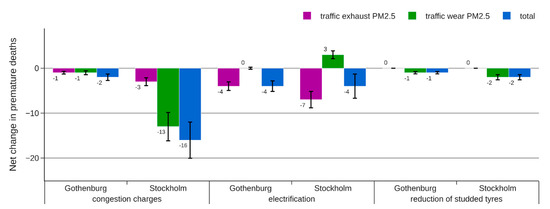 Many countries have proposed ambitious policies to reduce greenhouse gas emissions by encouraging a transformation towards a fossil-free vehicle fleet. Stockholm city has set a target to be completely fossil-free by 2040. The plans also include implementation of local environmental zones from which vehicles running on fossil fuels will be banned [19]. We represented this strategy by assuming that 50% of all light vehicles within the modelling area are electrified. The same strategy was also applied in Gothenburg. Exhaust emissions are obviously reduced to zero for electric vehicles, but non-exhaust particles from road, tire, and brake wear are also expected to change. This has been overlooked in some previous studies [20,21], leading to overly optimistic expectations on air quality improvements due to electrification. While particle emissions from brake wear are expected to decrease due to use of regenerative braking systems, road and tire wear emissions are likely to increase due to the higher weight of the electric vehicles. The road and tire wear emissions are assumed proportional to weight [22]. A new electric vehicle is expected to weigh 25% more than a corresponding vehicle with a combustion engine [23]. A reduction by 30% is assumed for brake wear emissions [23]. In countries with cold winters, the increase of road wear is also affected by the use of studded tires. In this scenario, the fraction of electric vehicles using studded tires was the same as for light vehicles in the baseline fleet. Brake wear is assumed to contribute 20% of PM2.5 wear emissions and 1% of PM2.5–10 wear emissions; the rest of the wear emissions are caused by road and tire wear [17]. Assumptions related to change in wear emissions are summarized in Table 4 and the changes in emissions and population exposure are presented in Table 5.