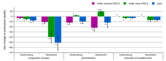 For the introduction of congestion charges, the differences between Stockholm and Gothenburg seen for all three HIA approaches in Figure 5 are mainly caused by differences in the observed traffic reduction in the two cities. The differences for the other two abatement strategies are caused by minor differences in the baseline related to vehicle fleet composition, share of PM2.5 in wear PM, and share of studded tires.