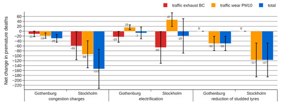For the electrification strategy, the increased road wear emissions to some extent compensate for the reduced exhaust emissions, resulting in a modest net reduction in attributed mortality. All HIA approaches indicate an effect in the range of −4 to −19 premature deaths, but the 95% CI of approach C is wider, indicating a possible increase in attributed mortality when the effect of coarse PM is considered in the analysis.