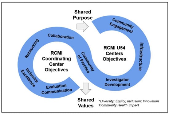 The inter-linked objectives of the RCMI Coordinating Center and the RCMI U54 Centers is anchored in a shared purpose, and centered on shared values of diversity, equity, inclusion, innovation and community health impact.