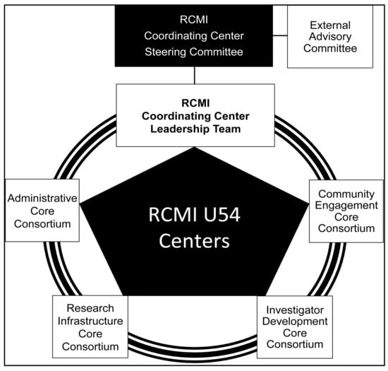 For example, the Administrative Core Consortium includes the RCMI-CC Contact PI Steering Committee Chair and all the U54 Centers principal investigators/program directors. The Evaluation Consortium resides within the Administrative Core of each RCMI U54 Center and the RCMI-CC. The Community Engagement Core Consortium, Investigator Development Core Consortium, and Research Infrastructure Core Consortium are similarly configured to include the directors from the respective cores and the RCMI-CC MPIs.
