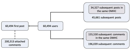 Statistics of the collected OMHC dataset. The “subsequent posts/comments in the same OMHC” means the posts/comments that users published subsequently in the same OMHC as their first post.