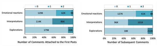 In addition to playing an important role in face-to-face interpersonal interactions, empathy is also found in online interactions []. Pfeil and Zaphiris [] investigated empathy in an online community of older people and developed a coding scheme to analyze online empathy, including self-disclosure, light support, deep support, community-building, medical facts, and technical issues. Sharma et al. [] further proposed a comprehensive structure of empathy in text-based, asynchronous, peer-to-peer support conversations, which consisted of three dimensions (reactions, interpretations, and explorations) and three levels in each dimension (no communication, weak communication, and strong communication).