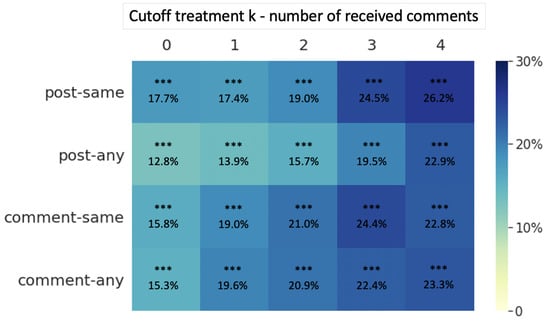 For the comparison between users who received more comments and those who received fewer comments, the results (Figure 3) show that, no matter which cutoff point is chosen, receiving more comments on the first posts always leads to a higher subsequent return probability. However, unlike previous research [], our results did not show the effect of “diminishing returns”; instead, the treatment effect is even greater when the cutoff point is set greater.