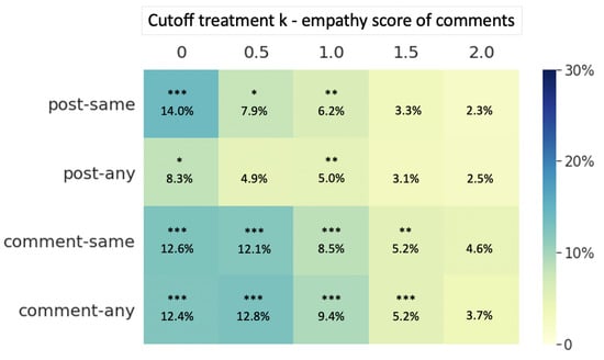 This study further examined the relationship between the empathy level of received comments and users’ subsequent online behaviors. As for the return probability, this study suggests that the users in the “empathic group” that received comments with a higher empathy level would be more likely to provide social support for others. This result is aligned with research that showed the positive relationship between empathy and user engagement such as content contribution [] and interpersonal interactions [], while also contributing to the big picture of online empathy since we consider a different online behavior—providing others with social support. We also tried different cutoff points of the average empathy score to divide users into “empathic group” and “non-empathic group”. When increasing the cutoff point, we observed the diminishing effect size. This means that, when a post received comments with a relatively low average empathy level, it would be more effective to improve the empathy level of comments for increasing the users’ subsequent engagement.