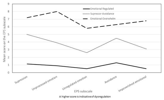 Hierarchical cluster analysis suggested a three-cluster solution. When analyzing the fusion coefficients between cases and the dendrogram, we found that the underlying structure of the data is adequately reflected in a solution of three relatively homogeneous groups without large fusion coefficients. The automatic solution provided by two-phase cluster analysis maintained the three-group solution with a value of 0.6 for the Silhouette measure of cohesion and separation valued at the highest quality level []. The additional evidence for the validity of the 3 groups is adequate since it fits with the existence of an intermediate emotional regulation profile according to the literature [,,] and because of the predictive validity subsequently found with respect to clinical measures []. Cluster 1 (n = 33, 27.5%) was labeled Emotional Overwhelm, Cluster 2 (n = 44, 36.7%) was called Avoidance/Non-Impoverished, and the third was Emotional Regulated (n = 43, 35.8%). The three groups do not differ in terms of demographic variables (age, level of education, or time since the report was filed, all p > 0.05). The mean scores for all emotional processing sub-scales included in the cluster analysis are presented in Table 1, and Figure 1 visually presents the profile of the 3 clusters extracted. The Emotional Overwhelm cluster had the highest scores on all sub-scales of the Emotional Processing Scale, the Avoidance/Non-Impoverished cluster had intermediate scores on all sub-scales, and the Emotional Regulated cluster had the lowest-value scores in all measures. The profile of the three groups maintains a common silhouette, although in the Avoidance/Non-Impoverished profile, the score on the avoidance sub-scale is close to that of the Emotional Overwhelm group, while the score on the Impoverished Emotional Experience sub-scale is close to that of the Emotional Regulated group. The effect size of the differences between the three clusters (ηp2) is high for all variables, far exceeding the usual 0.14 criterion to be considered a large size [] (see Table 1).