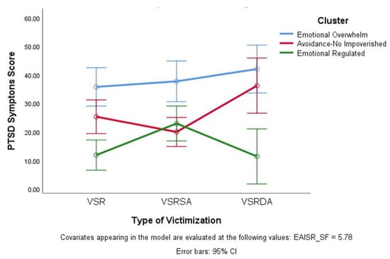 The results of the ANCOVA showed a significant global effect for the model (F(9.118) = 11.5, p < 0.001; ηp2 = 0.49), a non-significant effect for type of victim, a significant effect according to the emotional regulation group (F(2.118) = 27.9, p < 0.001; ηp2 0.34), a significant interaction between type of victim and emotional regulation group (F(4.114) = 10.5, p < 0.05; ηp2 = 0.09), and a significant effect for the covariable childhood trauma (F(1.114) = 7.7, p < 0.01; ηp2 = 0.064). Post-hoc comparisons in post-traumatic stress symptoms according to the emotional regulation group showed statistically significant differences between the three possible comparisons (all p < 0.001). Furthermore, the interaction pattern between type of victim and the emotional regulation group showed that for VSR and VSRDA women, the Emotional Regulated group differs from the other two emotional regulation groups in post-traumatic symptoms, and that in the VSRSA group of women, the Emotional Regulated and Avoidance/Non-Impoverished groups differ from the Emotional Overwhelm group in post-traumatic symptoms (see Figure 2). Table 2 shows the mean values for PTSD symptoms in each emotional regulation group and victim type.