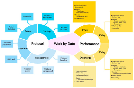 The nursing service protocol developed in the present study consisted of the following four domains: patient, nursing, structure, and management (see Figure 2). The patient domain comprised of a patient list, patient statistics, and medication information, and the nursing domain comprised of work by date, medication instructions, and nursing handover. The structure domain consisted of computer preparations by each nurse and shift work, and the management domain consisted of infection control, supply management, and problem handling. The work-by-date information included the non-contact nursing counseling service’s key activities.
