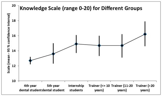 | 4th Year Dental Student (143) | 5th Year Dental Student (35) | Internship Dental Student (24) | Trainer <=10 Years (9) | Trainer 11–20 Years (18) | Trainer >20 Years (14) | p | |