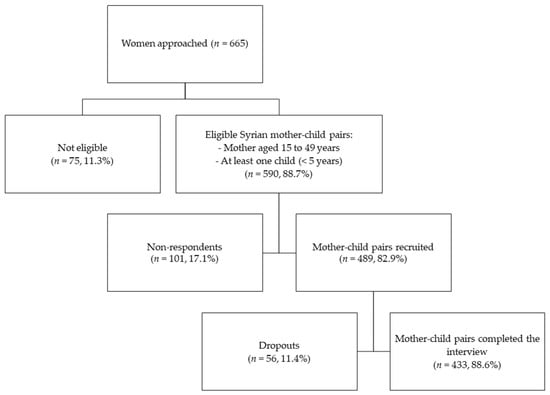 Previous estimates of the anemia prevalence among Syrian refugee women (26.1%) and children under five in Lebanon (21.0%) were used for the calculations of the sample size [25]. Based on the highest prevalence found among women, a required sample of 296 mothers was estimated at a 95% confidence interval (95% CI) with a 5% margin of error. The sample size was adjusted with an estimated design effect of 1.5 for the sampling design (N = 444). Considering an estimated non-response rate of 15% and a dropout rate of 10%, a total of 555 mother–child dyads were targeted for the survey. Inclusion criteria for women of reproductive age to participate in this study were: (1) to hold the Syrian nationality, (2) to be between 15 and 49 years old, (3) to have a child aged between 0 and 59 months, (4) for the child to hold the Syrian nationality, and (5) for the child not to suffer from any inborn errors of metabolism or physical malformations. A convenience sample was used to recruit all eligible mothers at the selected centers. When multiple children under five years were eligible within one family, one child was selected randomly. Figure 1 represents the flowchart of the subjects’ recruitment into the survey depicting a non-response rate of 17.1% and a dropout rate of 11.4%. Of the completed interviews, all Syrian pregnant, lactating, and non-pregnant non-lactating mothers with one child below the age of five years were selected for this study (N = 433).