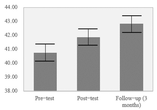 To assess the “maintenance effect” that teachers might have had on the maintenance of these results, it was determined whether the changes in the observed variability of the mean scores for the three measured time points were statistically significant. For the subscales of the Peer Bullying Questionnaire, the results were as follows: verbal abuse: Fintra (1, 328) = 18.49, p < 0.001, η2 = 0.12; direct social exclusion: Fintra (1, 328) = 12.28, p < 0.001, η2 = 0.075; threats: Fintra (1, 328) = 7.37, p = 0.001, η2 = 0.05; cyberbullying: Fintra (1, 328) = 1.59, p = 0.21, η2 = 0.01; indirect social exclusion: Fintra (1, 328) = 7.08, p < 0.001, η2 = 0.05; object-based aggression: Fintra (1, 328) = 4.79, p = 0.009, η2 = 0.03; physical abuse: Fintra (1, 328) = 18.87, p < 0.001, η2 = 0.11. For the subjective health and well-being variable measured with the KIDSCREEN-10 index, the results were Fintra (1, 328) = 12.29, p < 0.001, η2 = 0.10. Finally, for the variables of the Spanish version of the Social-Emotional Health Survey-Primary-Revised, the results were as follows: optimism: Fintra (1, 328) = 7.16, p = 0.001, η2 = 0.05; gratitude: Fintra (1, 328) = 1.15, p = 0.310, η2 = 0.01; zest: Fintra (1, 328) = 3.98, p = 0.020, η2 = 0.03; persistence: Fintra (1, 328) = 1.15, p = 0.320, η2 = 0.010; prosociality: Fintra (1, 328) = 2.20, p = 0.113, η2 = 0.02; co-vitality: Fintra (1, 328) = 4.69, p = 0.010, η2 = 0.04.