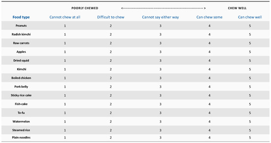 Masticatory ability was evaluated by asking the participants to complete a questionnaire listing 14 kinds of food ranging from soft and easy-to-chew food to hard food. Fourteen kinds of food included among the 30 kinds of food used in a previous study were included [25]. A five-point Likert scale was used, with a higher score indicating a better masticatory ability, as follows: 1 point (cannot chew at all); 2 points (difficult to chew); 3 points (cannot say either way); 4 points (can chew some); and 5 points (can chew well). (Figure 1).