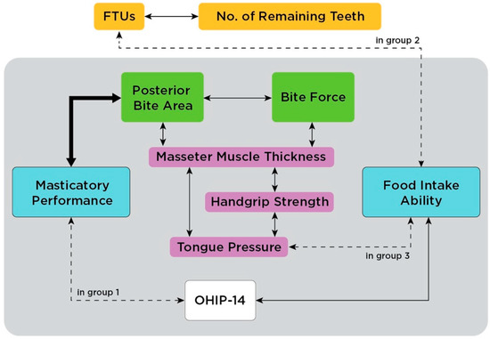 RT: number of remaining teeth, FTUs: functional tooth units, MP: masticatory performance, HG: handgrip strength, PBA: posterior bite area, ABA: anterior bite area, BF: bite force, MMT: masseter muscle thickness, FIA: food intake ability, TP: tongue pressure.