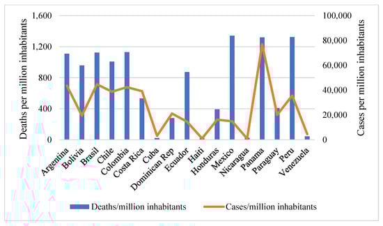 The number of deaths per million inhabitants varies considerably among the countries analyzed, as shown in Figure 1. The highest figures are found in Mexico (1342.41 deaths per million inhabitants), Peru (1324.04 deaths/million inhabitants), and Panama (1320.69 deaths/million inhabitants), and the lowest in Haiti (21.84 deaths/million inhabitants). The data shown were collected from the start of the pandemic (December 2019) until the beginning of February 2021.
