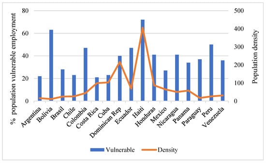 Percentage of population in vulnerable employment and population density. Source: own elaboration based on data provided by the World Bank.