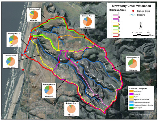 Clam Beach is located in northern California, USA, and is directly influenced by the Strawberry Creek watershed. Results of the sampling survey identified seven drainage areas with a variety of land uses, which are shown in Figure 1. Additionally, the primary land use by area is shown in Figure S1. Each sampling site is influenced by a variety of potential sources, which are summarized in Table S2. Sample site 1 is a beach monitoring sampling site at Clam Beach near Mad River and was chosen as a comparison site because it is not considered impaired. Sample site 2a is also a beach monitoring site at Clam Beach near Strawberry Creek. This site is considered impaired and is the primary focus of this study. Sample site 2b represents Strawberry Creek right before it meets Clam Beach. Sample sites 3–7 represent the headwaters of Strawberry Creek with site 5 having the most human and dog activity. Sites 8 and 9 represent the Patrick Creek watershed with residential and agriculture influences. Sites 10–11 represent upstream Strawberry Creek with the most potential for septic system influence. Site 12 is furthest upstream Strawberry Creek, with site 13 on Rose Creek as it meets Strawberry Creek.