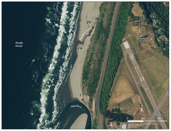 For this project there were two collection strategies. The first was an 11-h, single-day collection event at Clam Beach (beach study) and the second was an 8-week-long weekly collection strategy at the Strawberry Creek watershed (watershed study). Samples for the beach study were collected from 7:00 a.m. to 17:30 p.m. at three collection sites along Clam Beach on 6 August 2020 (Figure 2). The number of humans and dogs were directly counted during the collection period, while the number of birds were estimated. Samples were collected every 30 min at sample sites 2a and 2b. Sample site 2a was in the mixing zone of Strawberry Creek and the ocean. Sample site 2b was in Strawberry Creek, which was not influenced by the ocean and is approximately 100 ft. upstream from sample site 2a. For comparison, a third site at Clam Beach near Mad River (site 1) was sampled at low, medium, and high tides only, for a total of 12 samples collected. Replicate samples were taken at low (8:21 a.m.), medium, and high (15:02 p.m.) tides. Samples for the watershed study were taken from 22 May 2020 to 10 July 2020, collected at 13 locations along Clam Beach, Strawberry Creek, Patrick Creek, and Rose Creek (Figure 1). Sample site 2b was excluded in the watershed study. Samples were collected over an 8-week period with samples taken once.