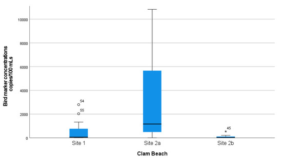 A complete summary of animal–host MST marker concentration measurements in samples collected at Clam Beach near Strawberry Creek is shown in Table 1. Additionally, a summary of MST marker concentration in samples collected at Clam Beach near Mad River is shown in Table 2. The mean distributions of ROS-adjusted bird marker concentrations from 07:30 a.m. to 17:30 p.m. are visually shown in Figure S3, with a single sample spike at noon of 44,058 copies/100 mL. The Kruskal–Wallis test was used to show that there is a statistically significant difference in the distribution of bird marker concentrations between sample collection sites (sites 1, 2a, and 2b), X2 (2) = 28.2 and p < 0.001. Distributions of the measured concentrations of bird marker concentrations collected at each site were compared visually using box and whisker plots (Figure 3). Furthermore, a Mann–Whitney U test was used to test the hypothesis that the distributions of bird marker concentrations were equal at collection sites 2a (mixing zone) and 2b (freshwater). There was a statistically significant difference in bird marker concentrations at site 2a (Md = 38.6, n = 27) and site 2b (Md = 16.4, n = 27), Mann–Whitney U = 66.0, p <0.001. This demonstrates that the bird marker concentrations and detections were significantly higher in the mixing zone (seawater) when compared to a Strawberry Creek source (freshwater).