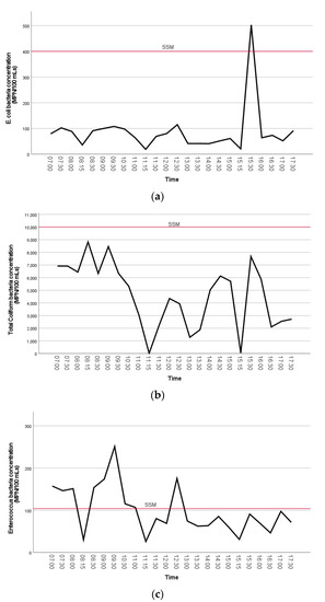 The concentrations of FIB bacteria are visually shown in the line plots below (Figure 4a–c). A Kruskal–Wallis test was used to test the differences of FIB concentrations between sample collection time by group (early morning, morning, afternoon). The Kruskal–Wallis test for comparison of time of day collected showed that there was a statistically significant difference in the distribution of TC bacteria concentrations between groups, X2 (2) = 19.1 and p < 0.001. Furthermore, there was a statistically significant difference in TC density between early morning (Md = 24.5, n = 16) and morning (Md = 12.6, n = 19), Mann–Whitney U = 48.5, p = 0.001. Distributions of the measured concentrations of TC bacteria collected from each sample time by group were compared visually using box and whisker plots (Figure S4). This shows that early morning concentrations of TC were higher than morning or afternoon samples.