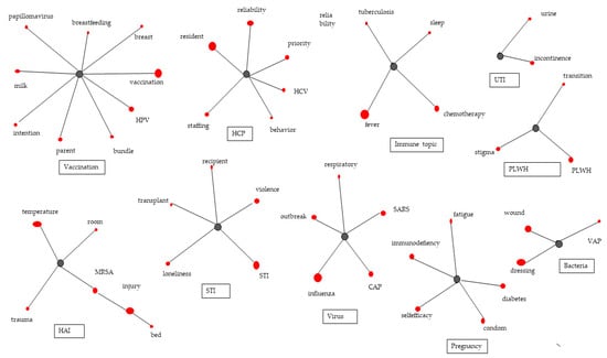 Sociogram of the keywords based on topic modeling. Note. HPV: human papillomavirus; HCP: healthcare professionals; UTI: urinary tract infection; PLWH: people living with HIV; MRSA: methicillin-resistant staphylococcus aureus; HAI: healthcare-associated infection; STI: sexually transmitted infection; SARS: severe acute respiratory syndrome; CAP: community-acquired pneumonia; VAP: ventilator-associated pneumonia.