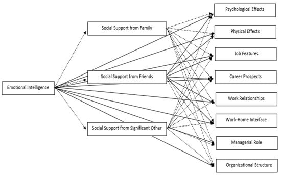 The current study takes into account support from family, friends, and significant others—which are little investigated in this specific field of study—to explore how not work-related sources of support affect occupational stress. This latter is defined as a broad concept in which effects on health (both psychological and physical) and work stressors (job features, career prospects, managerial role, work relationships, work–home interface, and organizational structure) are indicators. Figure 2 displays the hypothesized relationships among the investigated variables.