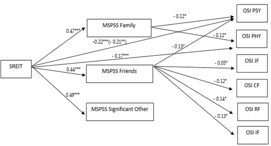 Measurement model testing the relationship between EI and occupational stress through social support. Only significant paths are shown. Direct effects are in parentheses. SREIT: Self-Report Emotional Intelligence Test; MSPSS = Multidimensional Scale of Perceived Social Support; OSI = Occupational Stress Indicator; OSI PSY = Psychological; OSI PHY = Physical; OSI JF = Job Factor; OSI RF = Relational Factor; OSI CF = Career Factor; OSI IF = Work–Home Interface Factor. * p < 0.05, ** p < 0.01, *** p < 0.001.