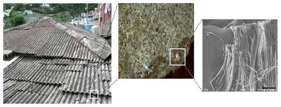- Jeong, J.W.; Cho, S.; Park, G.T.; Lee, S.J. Health risk assessment and evaluation of asbestos release from asbestos-cement slate roofing buildings in Busan. J. Environ. Sci. Int. 2013, 22, 1579–1587. [Google Scholar] [CrossRef]