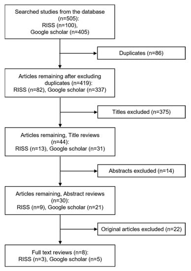 The literature search included all thesis and research reports published in Korean journals. When a master’s article was published in a journal, the article published in the peer-reviewed journal was selected. However, if the research was the same, but the required results were not available in the published article, the master’s article was also cited. All the articles identified in the initial search were first screened by title, and then by abstract. Finally, the entire text was reviewed and selections were made.