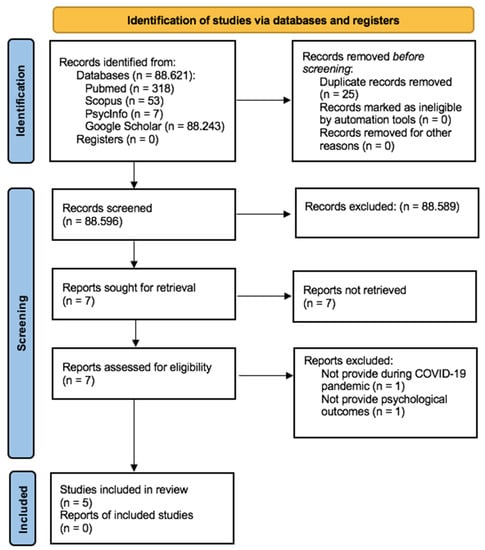 The remaining seven records were evaluated for inclusion by reviewing their full texts and resulted in the exclusion of two articles for the following reasons: the psychological intervention was not provided during the COVID-19 pandemic/focused on COVID-19-related psychological problems (n = 1) [46] and did not provide psychological outcomes (n = 1) [47].