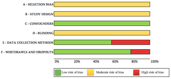 Three out of the five selected articles [3,24,32] had a moderate methodological quality (one weak rating), while the remaining two studies [40,41] showed a strong methodological quality (no weak ratings). The rating of each selected study is presented in Supplementary Material Table S1, while a Bias Analysis Graph is presented in Figure 2.